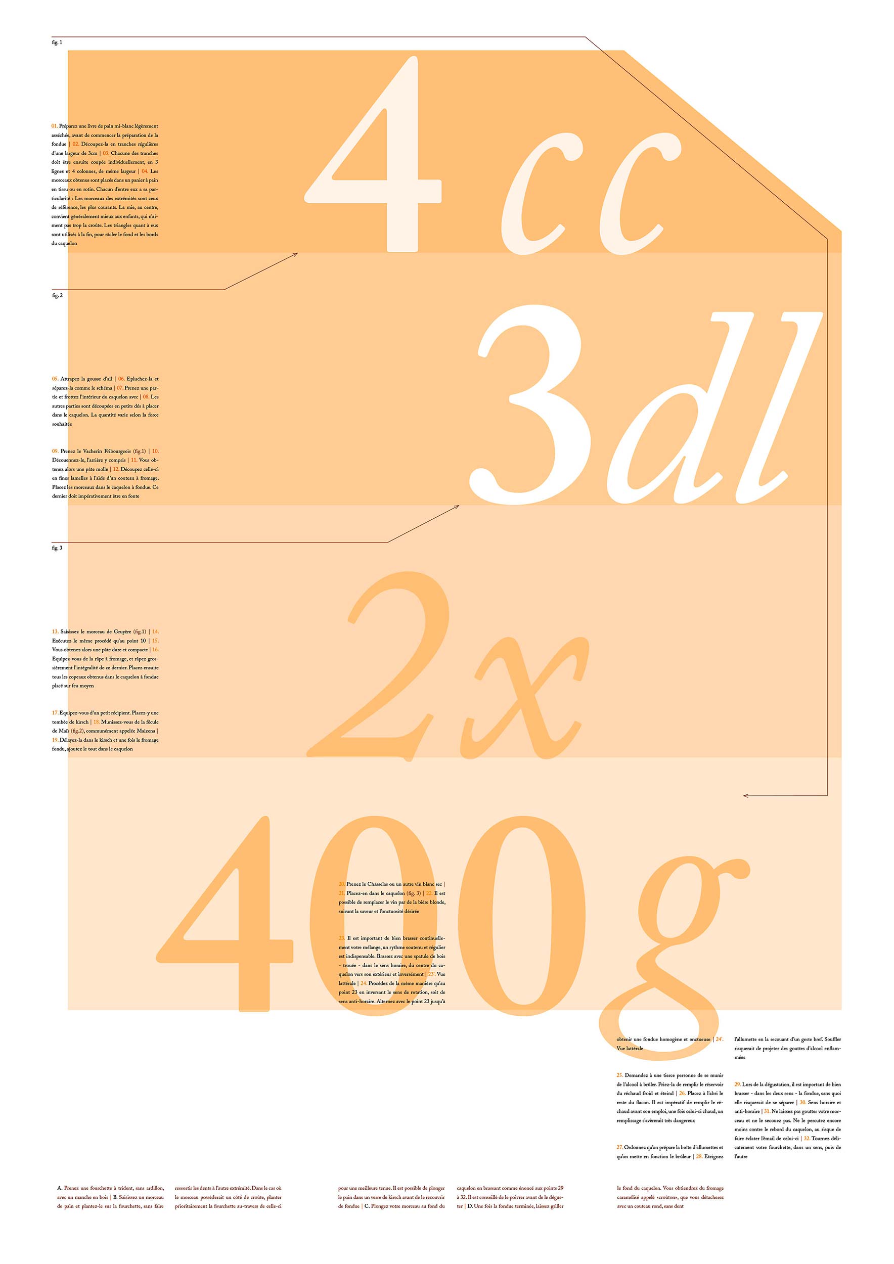 Dépliant présentant didactiquement la manière la plus simple de réaliser une fondue. Le processus est exposé sous forme d’étapes, selon la hiérarchie des éléments. Au verso, une affiche mélangent le procédé et les ingrédients à préparer avant de commencer la recette.