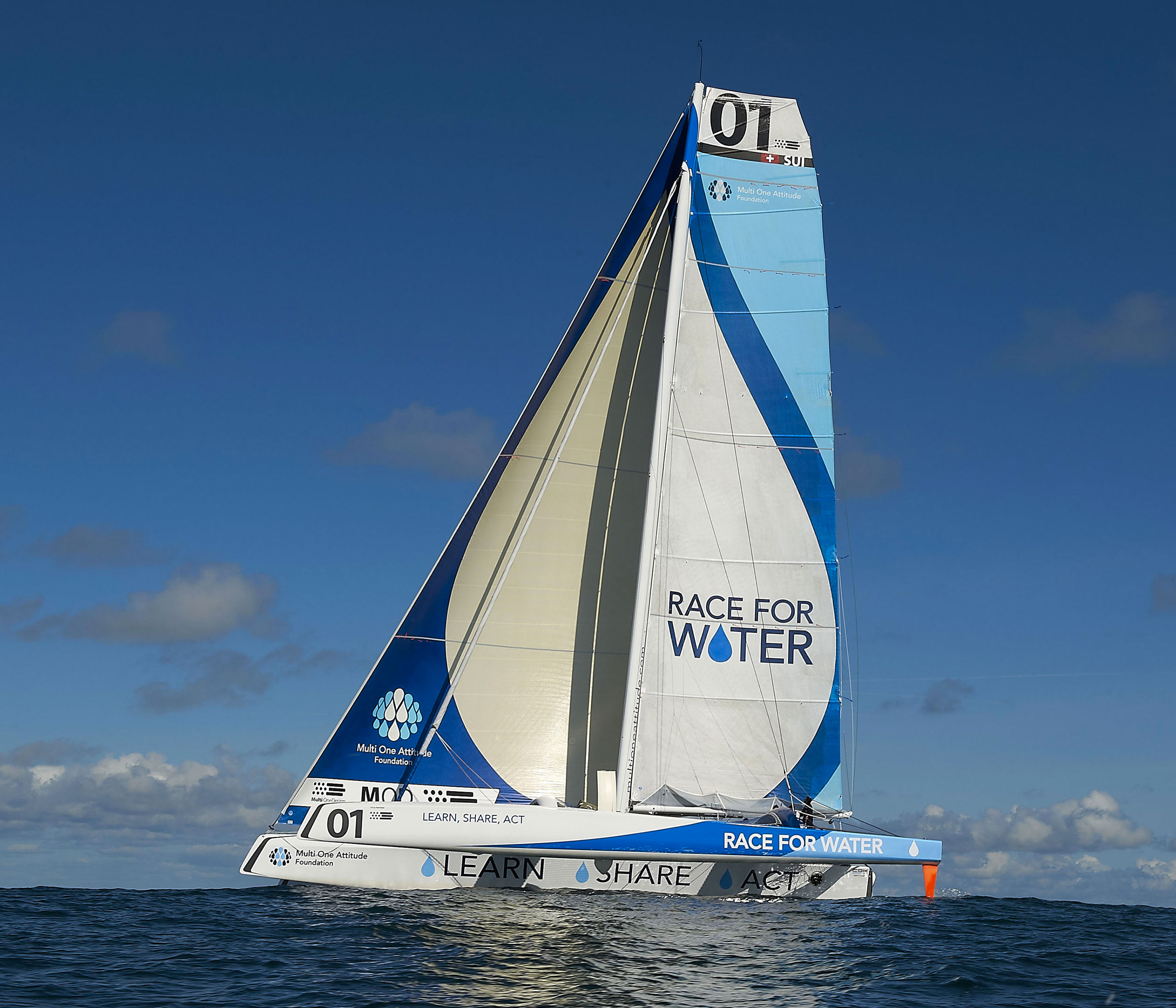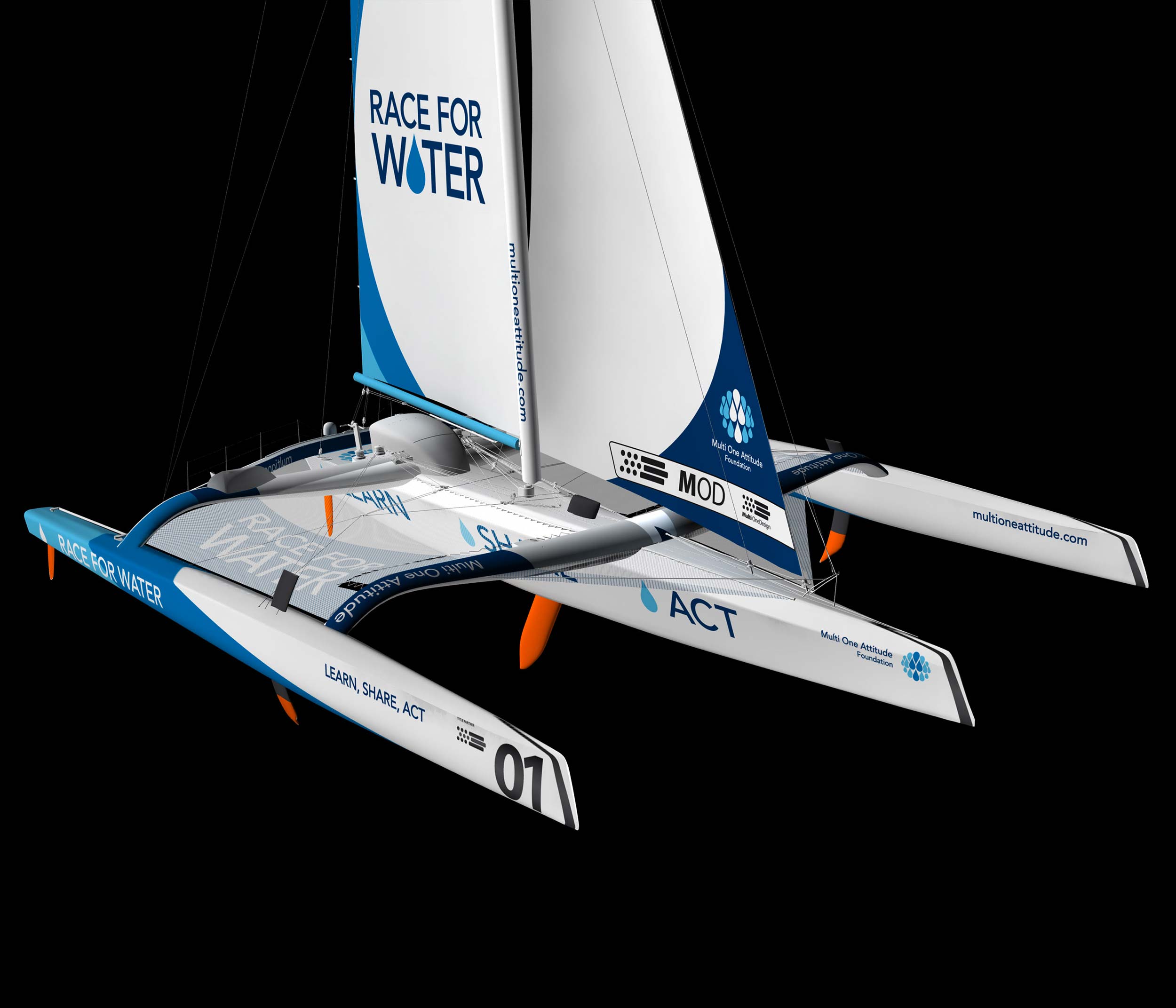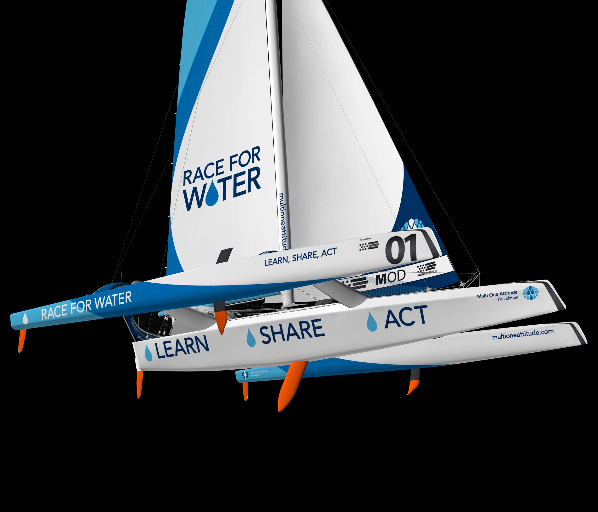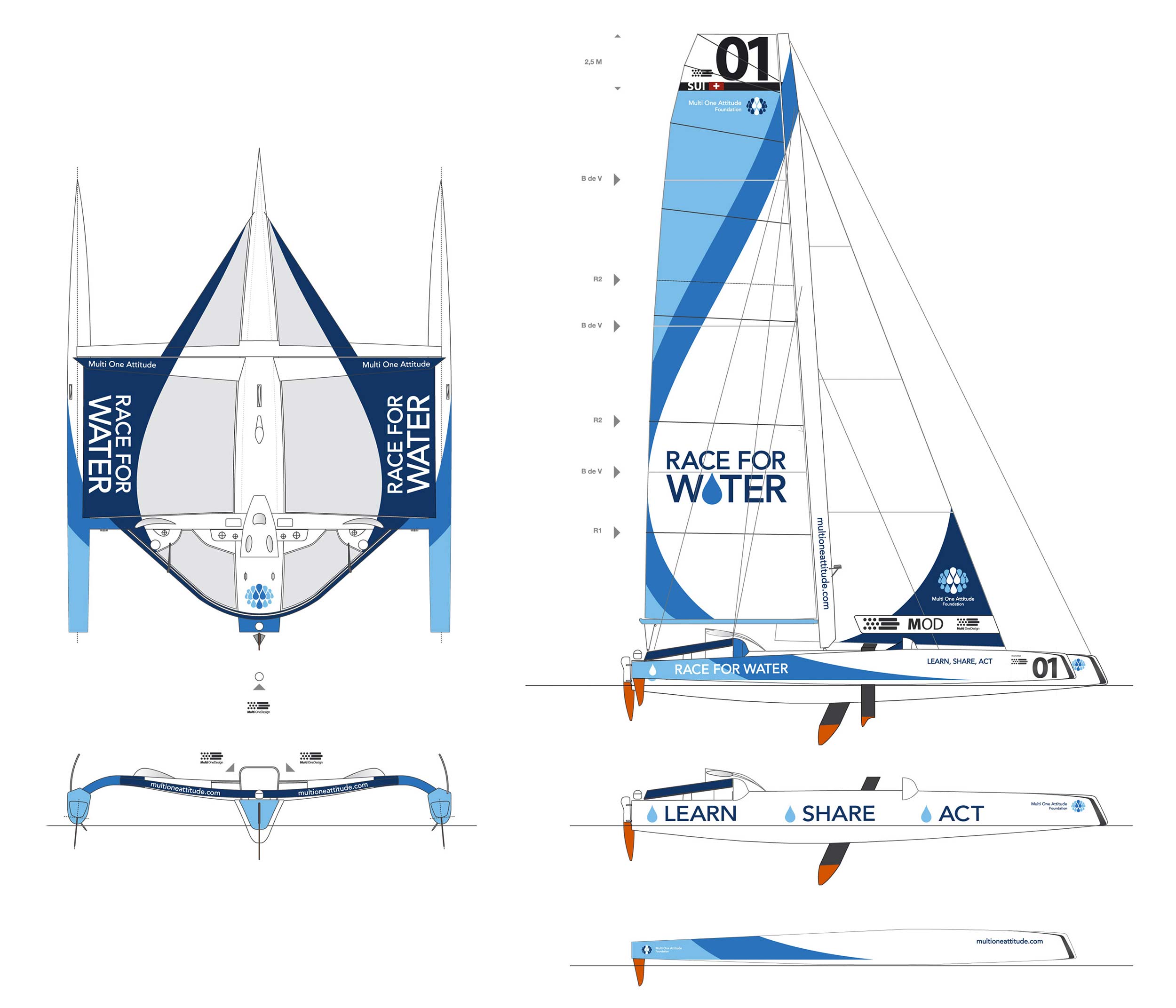 Le concept imaginé est de faire coexister une goutte d’eau, symbole de la fondation, avec la forme générale du bateau. Celle-ci est perceptible de ses côtés et de son sommet. L’équipe voulait se démarquer des autres trimarans, où la publicité dégrade la pureté des voiliers. Le slogan « Learn, Share, Act » figure sur le flotteur central et dévoile son impact aussitôt que « Race for Water » prend son envol.