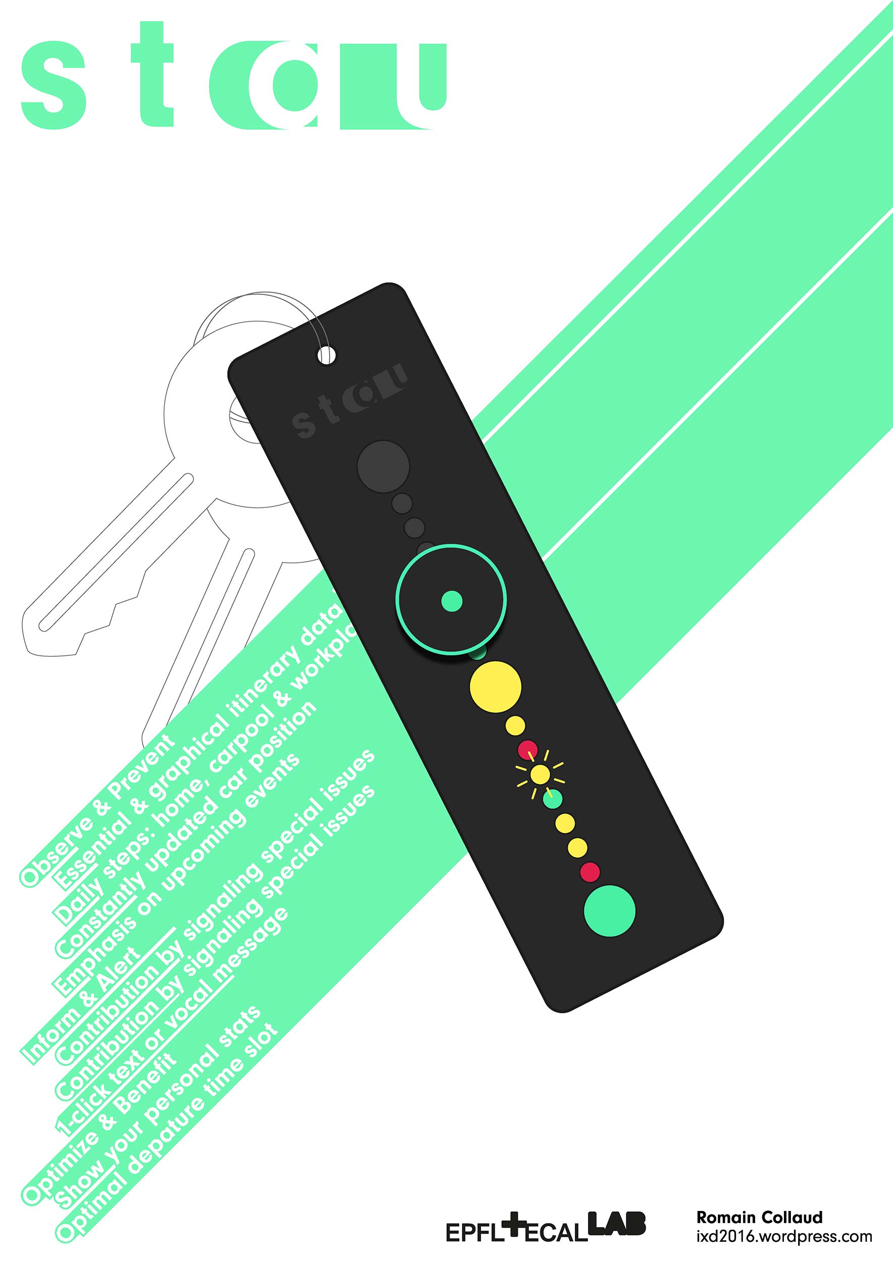 STAU takes traffic data of your daily route (ex. Google) and keeps only the essential information displaying colored dots around your daily steps. Your position is constantly updated by a self-moving disc emphasizing upcoming events and letting your friends or colleagues know of your progress. By dragging your position disc, the keychain indicates upcoming events: by pressing it, you can signal special issues (ex. car crash) to other drivers using the service. With only one click, it informs people of your delay by sending pre-written SMS or notifications or even voice messages. Thanks to your collected data & live traffic updates, the system can guess the best departure time or warn against premature departures and indicates when it’s the best time to leave! STAU – stressless auxiliary – won’t let you alone, stressed, in a traffic jam.